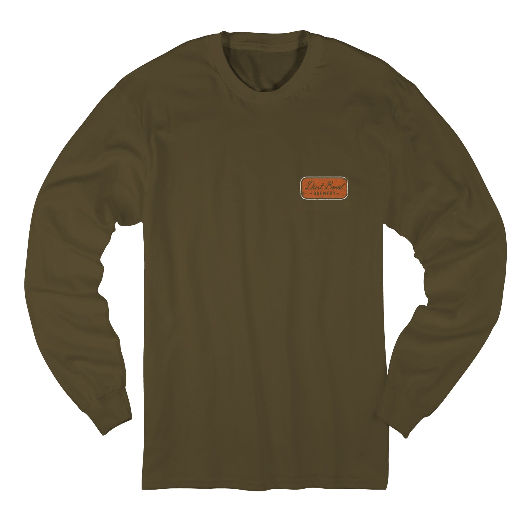 Long sleeve olive t-shirt with orange Dust Bowl Brewery logo on front and back.